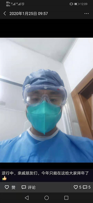 翁慧斌,消化內(nèi)科副主任醫(yī)師,1月19日選派到發(fā)熱門診坐診,這是他在年初一時(shí)留下的一張自拍,小編采訪問:怕嗎?他說,“害怕倒是沒有,畢竟是醫(yī)生,這是我們的職責(zé),就像戰(zhàn)士要上戰(zhàn)場(chǎng)樣,都是我們應(yīng)該做的。”