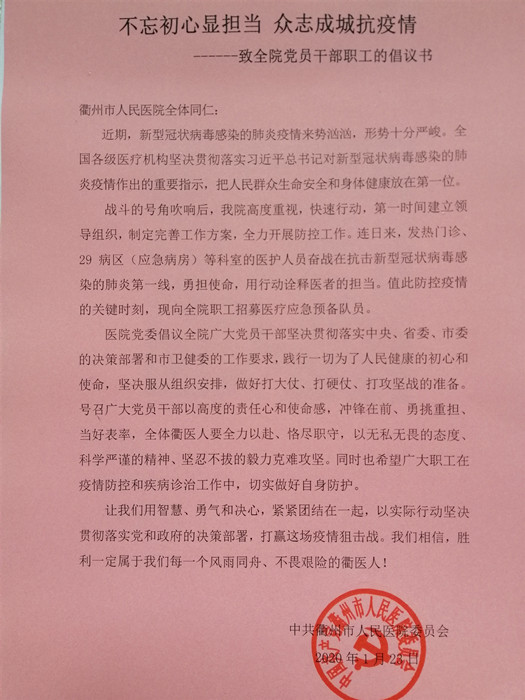 隨著新型冠狀病毒肺炎疫情的持續(xù)變化,我院防疫控疫的號角又一次吹響。1月26日,醫(yī)院黨委向全院黨員干部職工發(fā)出倡議,組建新型冠狀病毒感染肺炎防控應(yīng)急后備志愿隊(duì)。