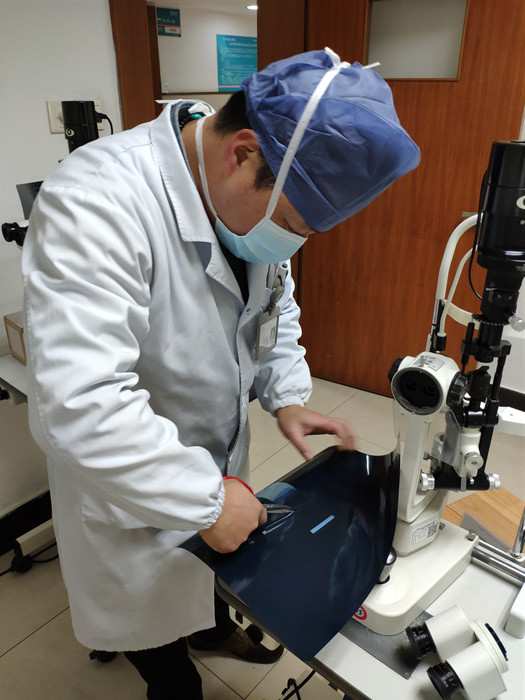 為迎接節(jié)后患者就診高峰期,眼科主任姜方正帶領眼科醫(yī)生開展“生產自救”。他們利用CT、磁共振等廢膠片,自制簡易防護屏,給檢查用的裂隙燈顯微鏡裝上一道防護。