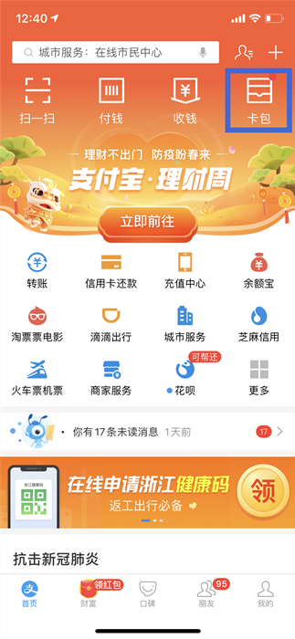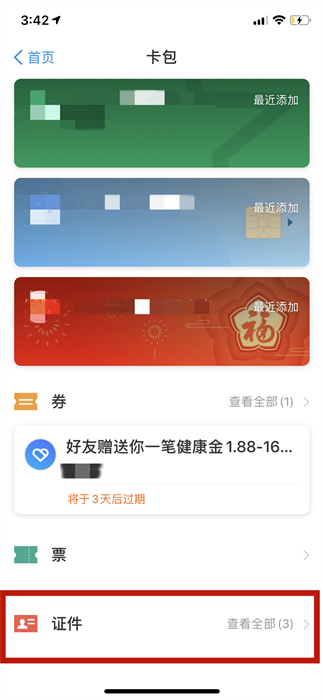 1、打開“支付寶”APP首頁,點(diǎn)擊:卡包→證件→健康碼。