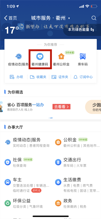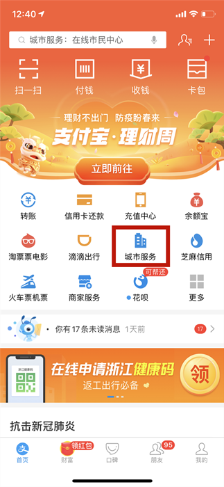 方法二:打開“支付寶”APP首頁,點(diǎn)擊:城市服務(wù)→衢州健康碼。