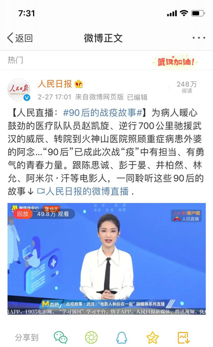 文章來源:人民日?qǐng)?bào)微博、中國電影報(bào)道微博 宣傳統(tǒng) 作者:徐莉 點(diǎn)擊數(shù):5752 更新時(shí)間:2020-02-27