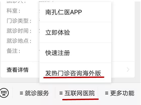 (二)點(diǎn)擊第二個菜單“互聯(lián)網(wǎng)醫(yī)院”,選擇‘發(fā)熱門診咨詢海外版