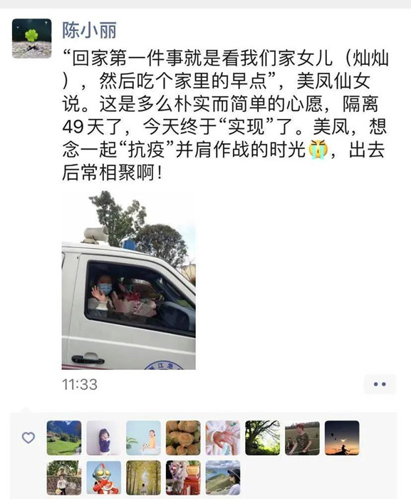 1月28日入駐隔離病房,3月16日“出關(guān)”,過(guò)去的49天,她經(jīng)歷了隔離病房醫(yī)護(hù)團(tuán)隊(duì)經(jīng)歷的一切,護(hù)目鏡的壓痛要忍受,防護(hù)服的悶熱都要克服。有些時(shí)候,護(hù)理工作能否順利開(kāi)展,除了專業(yè)素養(yǎng)、護(hù)理經(jīng)驗(yàn),更需要意志力和解決困難的辦法。在隔離病房,患者對(duì)護(hù)理工作的理解和包容,讓徐美鳳感動(dòng)不已?!坝浀糜幸淮芜M(jìn)病房采血,護(hù)目鏡被霧氣模糊后,看不清患者的靜脈,在患者的手臂上找了好一會(huì)也沒(méi)找到,無(wú)奈下,我向患者解釋面屏模糊了,采血有點(diǎn)困難,稍等一下好嗎?”沒(méi)想到患者不但沒(méi)有絲毫責(zé)怪,反而安慰說(shuō):“沒(méi)關(guān)系,你們也很不容易。”那一刻,她被暖到了?!坝械幕颊呖吹轿覀冞M(jìn)入病房,會(huì)善意地提醒我們說(shuō),他們是病人,護(hù)理時(shí)要離他們遠(yuǎn)一點(diǎn),不要靠得太近。”這樣一句將心比心的話也讓美鳳感動(dòng)許久,她說(shuō),醫(yī)患關(guān)系的微妙源自彼此的尊重和信任。