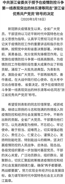 近日,中共浙江省委授予在疫情防控斗爭第一線表現(xiàn)突出的40名同志“浙江省優(yōu)秀共產(chǎn)黨員”稱號(hào)。衢州市人民醫(yī)院的田明慶被授予“浙江省優(yōu)秀共產(chǎn)黨員”稱號(hào)。