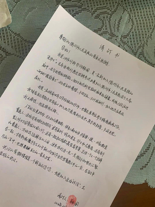疫情形勢嚴峻,2月9日,衢醫(yī)第二支援鄂醫(yī)療隊赴漢,醫(yī)院再次發(fā)出馳援疫情火線的號召,組建援鄂人員預(yù)備隊,這一次,韓圓寫下了請戰(zhàn)書。“我主動請纓,不論生死,不計報酬,加入此次應(yīng)急支援預(yù)備隊,去守護英雄的武漢!”在這份豪情滿滿的請戰(zhàn)書上,這個勇敢的姑娘摁下了紅指印。