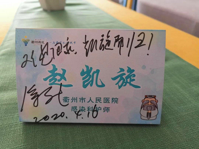 趙凱旋作為隊(duì)員代表,在儀式上發(fā)言:“不管怎么刮風(fēng),怎么下雨,太陽(yáng)總是要出現(xiàn)的。在我看來(lái),與其說(shuō)是我們帶給武漢人民希望,不如說(shuō)是武漢人民教會(huì)了我們?nèi)绾蚊鎸?duì)困境,這份面對(duì)暴風(fēng)雨的勇敢和堅(jiān)韌,如同金子般可貴,也終將成為我人生中的一筆寶貴的財(cái)富?!眲P旋用質(zhì)樸的話語(yǔ)講述在武漢奮戰(zhàn)的日夜,流露的真情深深地觸動(dòng)了大家,現(xiàn)場(chǎng)聽(tīng)眾眼中泛著淚光,這是凱旋的故事,更是在疫情火線奮戰(zhàn)的52名衢州醫(yī)療隊(duì)友的故事。