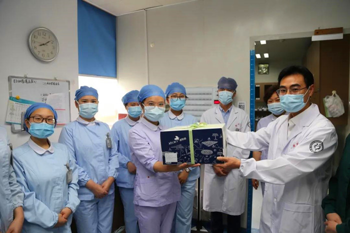 “今天是屬于你們的節(jié)日,祝愿你們平平安安、順順利利、健健康康!” 院領(lǐng)導(dǎo)分組來到臨床科室,為天使們送上甜美的節(jié)日蛋糕。