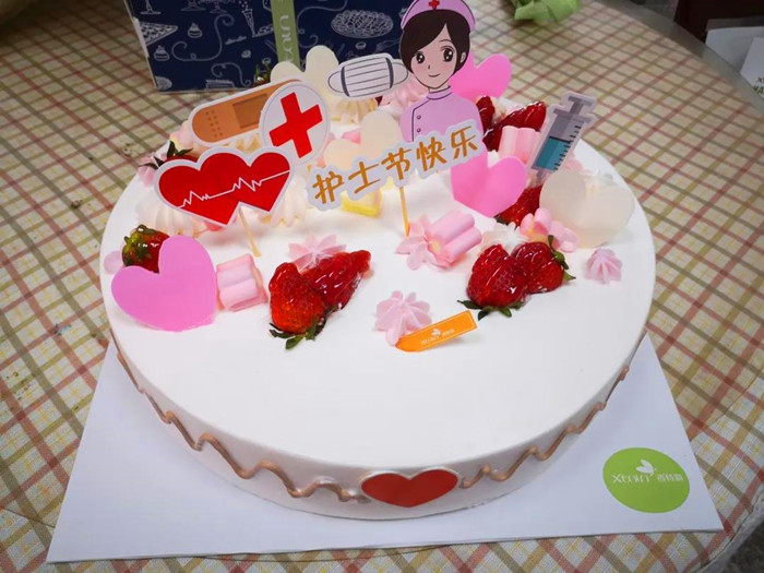 和白衣天使合影留念,親手切下蛋糕送到天使手中“祝福你們,希望你們今后的工作像花兒一樣多姿多彩,生活如同美麗的蛋糕一般甜甜美美!”
