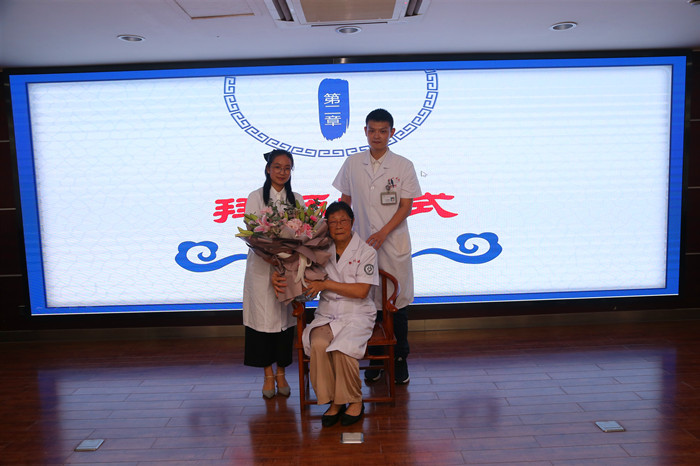 新一批中醫(yī)科年輕醫(yī)生向恩師行拜師禮、作揖禮、敬茶,送上鮮花