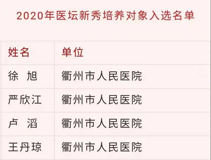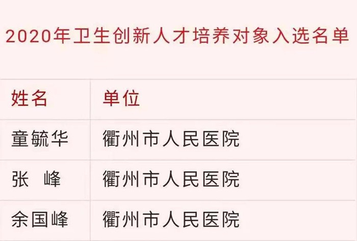 根據(jù)《浙江省新一輪衛(wèi)生高層次人才培養(yǎng)工程實(shí)施辦法》(浙衛(wèi)發(fā)〔2019〕58號)要求,經(jīng)個(gè)人申報(bào)、單位審核公示、主管部門推薦、專家評審、浙江省衛(wèi)生健康委黨委會(huì)審議等程序,遴選產(chǎn)生了2020年度衛(wèi)生創(chuàng)新人才和醫(yī)壇新秀培養(yǎng)對象。衢州市共11名對象成功入選,其中衛(wèi)生創(chuàng)新人才培養(yǎng)對象4名,衢州市人民醫(yī)院占3名,該成績實(shí)現(xiàn)醫(yī)院零突破;醫(yī)壇新秀培養(yǎng)對象7名,衢州市人民醫(yī)院占4名,在衢州醫(yī)療系統(tǒng)中遙遙領(lǐng)先。
