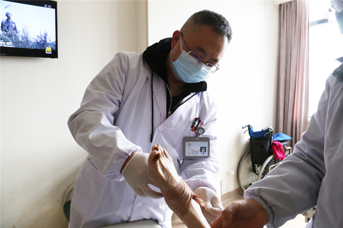 這位患者的足底皮膚出現(xiàn)發(fā)黑、干癟,局部塌陷,并且出現(xiàn)了膿性分泌物,清創(chuàng)后傷口未見明顯生長(zhǎng),創(chuàng)基呈現(xiàn)暗紅色,這種傷口呈全層皮膚缺失,換藥很難愈合?!?“這塊足底潰瘍區(qū)域是功能負(fù)重區(qū),但患者雙小腿很細(xì),皮瓣轉(zhuǎn)移風(fēng)險(xiǎn)很大,建議通過(guò)PRP技術(shù),采用自體細(xì)胞再生技術(shù),促進(jìn)自體細(xì)胞再生,必要時(shí)同時(shí)結(jié)合植皮修復(fù)。”在開化縣人民醫(yī)院病房,我院創(chuàng)面修復(fù)科執(zhí)行主任羅旭提出新的診療方案。