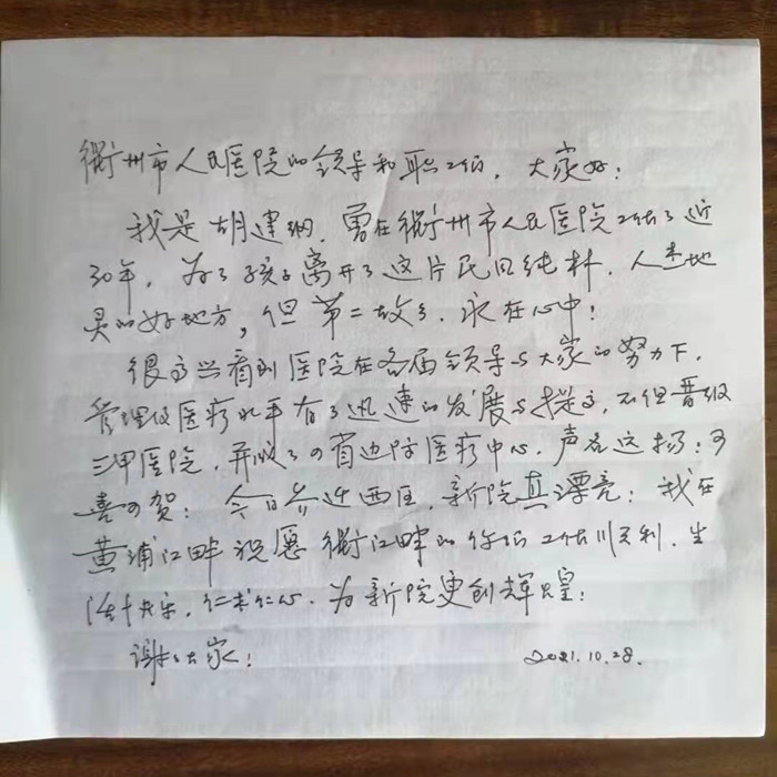 胡建綱曾于1983–1990期間擔(dān)任我院院長(zhǎng),在衢醫(yī)工作了近三十年,把自己的青春與激情都奉獻(xiàn)給了醫(yī)院,也見(jiàn)證了醫(yī)院的成長(zhǎng)與發(fā)展。欣聞醫(yī)院搬遷,送上了滿滿的祝福!