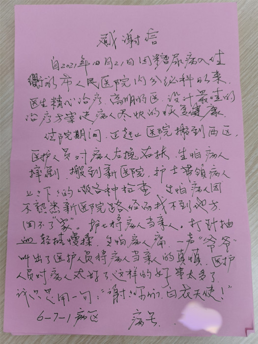 他在信中寫到:“住院期間正趕上醫(yī)院搬到西區(qū),醫(yī)護(hù)人員對病人左攙右扶,生怕病人摔倒;搬到新醫(yī)院,護(hù)士帶病人上上下下做各種檢查,生怕病人因不熟悉新醫(yī)院路線而找不到地方,回不了‘家’。”
