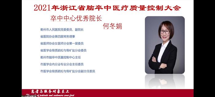 11月27日,從浙江省腦卒中醫(yī)療質(zhì)量控制大會傳來好消息,通過大會的前期選舉和推薦,我院副院長何冬娟榮獲“卒中中心優(yōu)秀院長”榮譽(yù)稱號,全省腦卒中質(zhì)控中心僅產(chǎn)生2位優(yōu)秀院長,該榮譽(yù)的獲得代表衢州地區(qū)卒中中心建設(shè)工作取得新突破。
