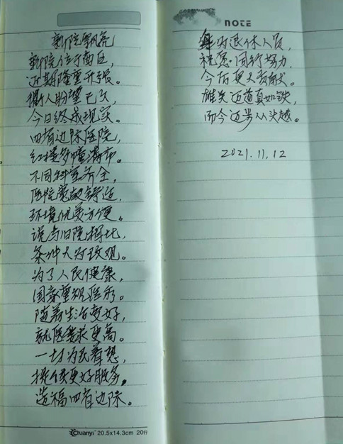 參觀新院區(qū),當(dāng)看到新院優(yōu)美的環(huán)境,他賦詞《新院漂亮》