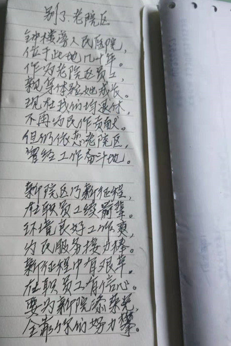 陳土根,72歲,中共黨員,骨科退休醫(yī)生,1968年10月參加工作,至今已退休12年,在醫(yī)院整體搬遷期間,他手書詩詞,些許顫巍的筆跡記載了對醫(yī)院的美好祝福。