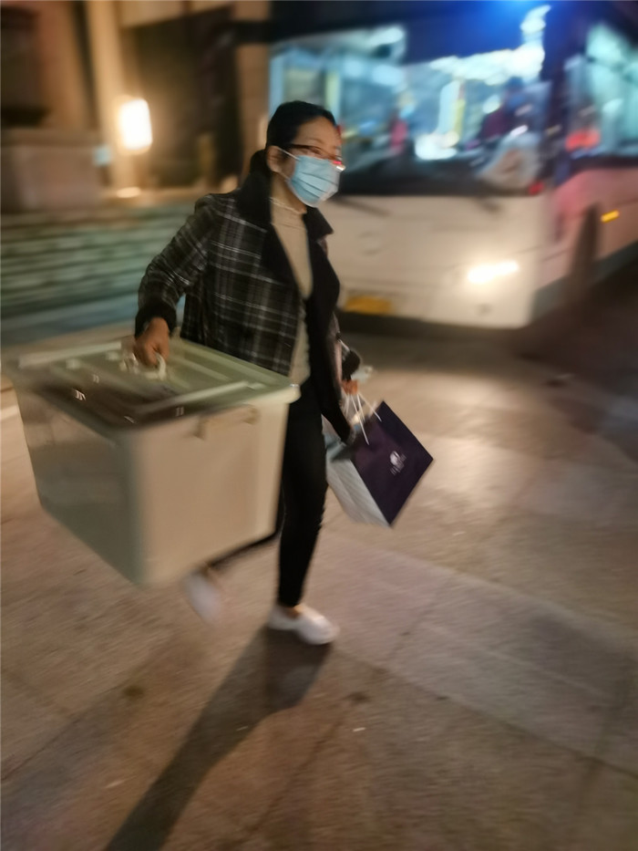 3月8日凌晨,抵達(dá)開化的第二天,由于臨時(shí)換車,她拎著一個(gè)大大的整理箱一路狂奔。