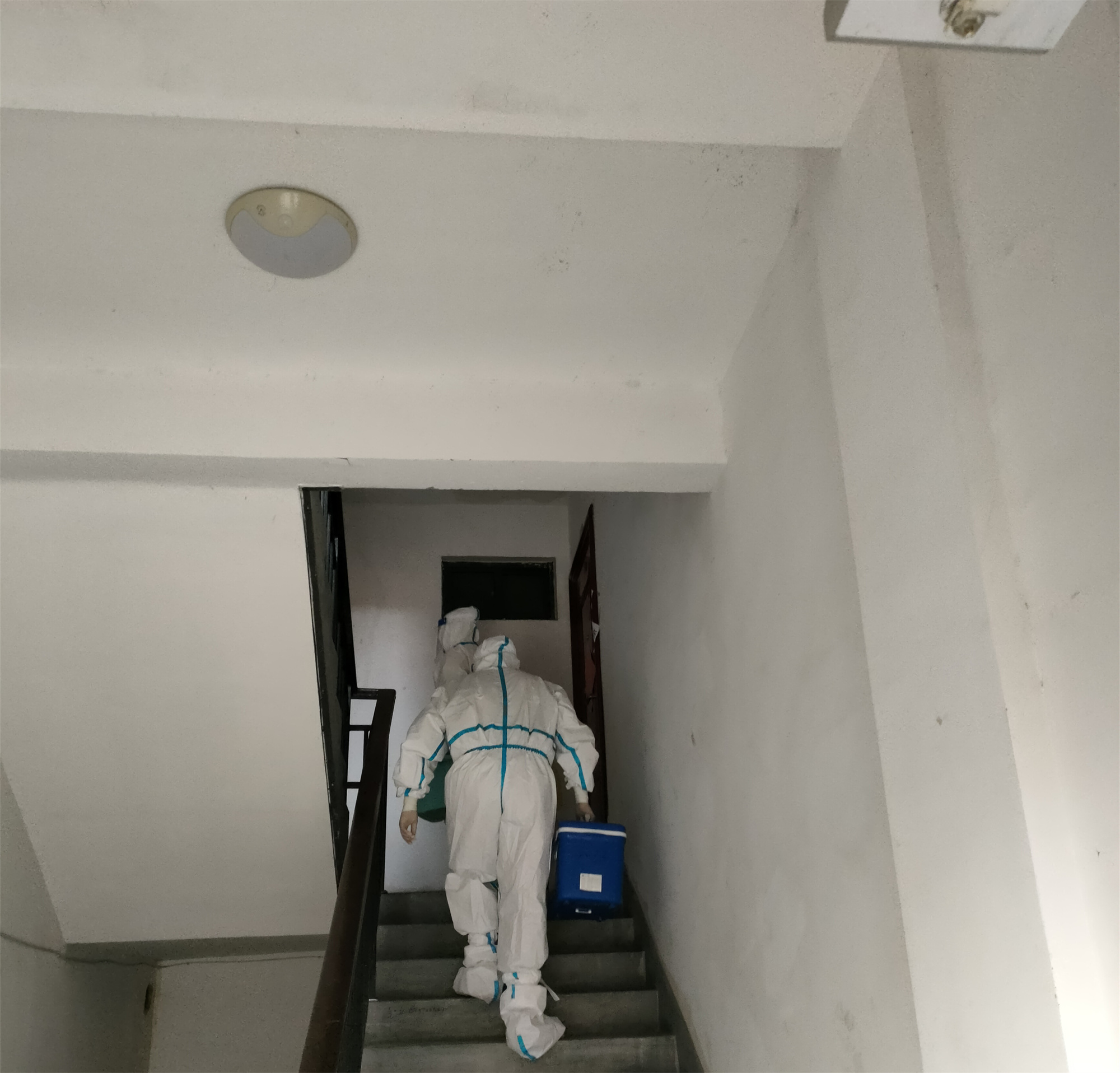 “我們組的任務(wù)是上門為年老體弱等不便下樓的人員上門采樣,市區(qū)的老小區(qū)沒有電梯,大多是老年人在此居住,我們要一遍又一遍的上樓、下樓?!被璋档臒艄庀拢臉堑览?,周曉兵步伐堅定。