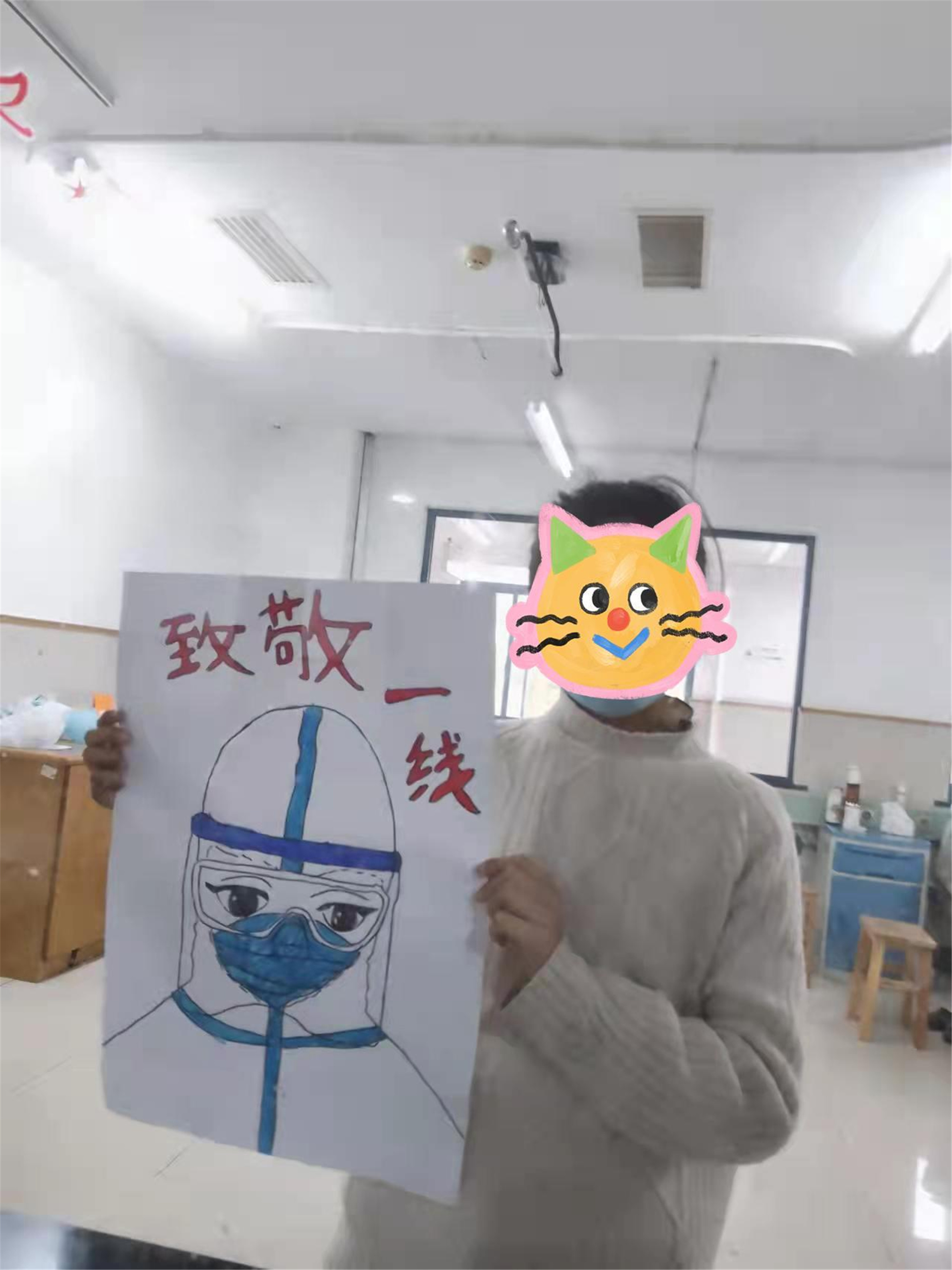 “這是我收到最珍貴的禮物,謝謝叔叔阿姨們,我會加油的!”原先不愛言語的小吳道出了內心深處最樸實的話語。小姑娘拿起畫筆,為其中的一位護士阿姨作肖像畫,并寫下:致敬一線。