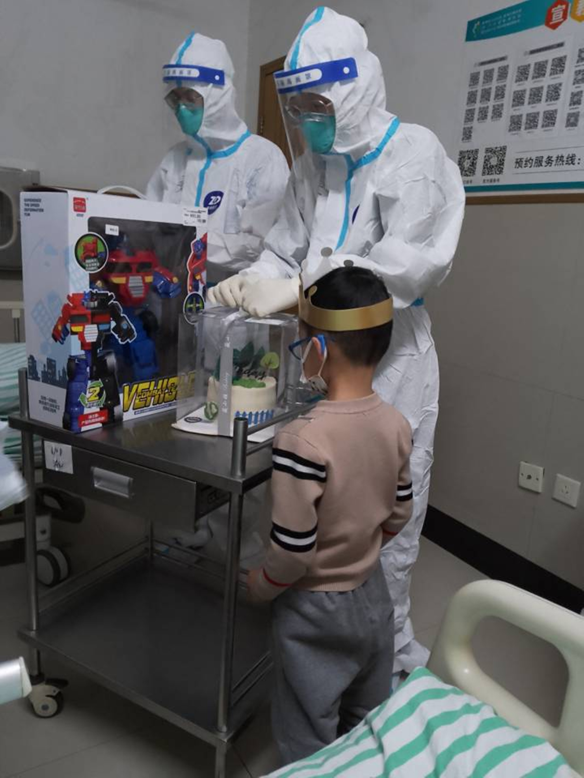 3月28日上午,在衢州市人民醫(yī)院隔離病房里,一場專門為小澤小朋友準(zhǔn)備的驚喜正悄悄降臨。當(dāng)生日蛋糕和玩具送到他的病床時,小澤小朋友高興地跳了起來,用他那稚嫩的口吻說道:“謝謝阿姨,我太喜歡了!”