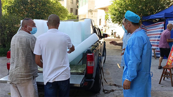 為了給采樣隊員降溫防暑,社區(qū)志愿者馬不停蹄地搬運(yùn)冰塊