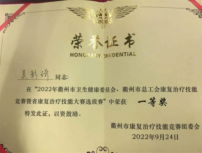本次競賽由來自衢州市16家醫(yī)院的40位選手同臺競技,代表了我市康復(fù)治療技術(shù)的最高水平。經(jīng)過一天的理論測試和技能操作比拼后,我院康復(fù)醫(yī)學(xué)科吳彰琦榮獲個人第一名、青年康復(fù)治療師團(tuán)隊獲得團(tuán)體第二名。