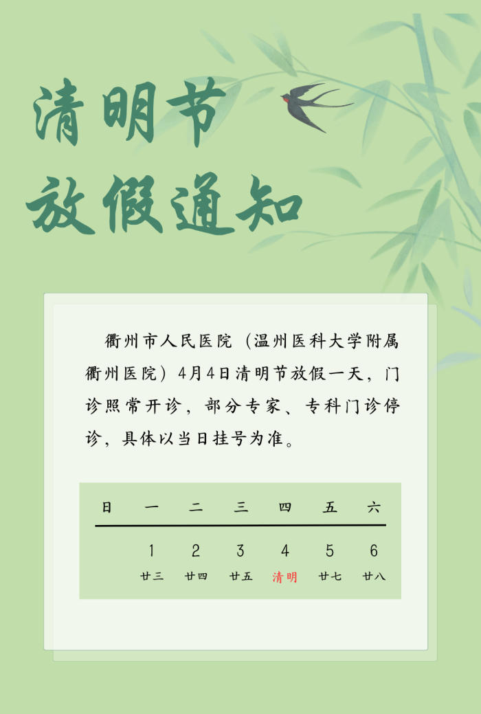 衢州市人民醫(yī)院2024年清明節(jié)門診安排 文章來源:門診部 作者: 點擊數(shù):1931 更新時間:2024-04-01 上一篇: 我院2024年清明節(jié)門診安排 下一篇: 歡度六一,童趣飛揚