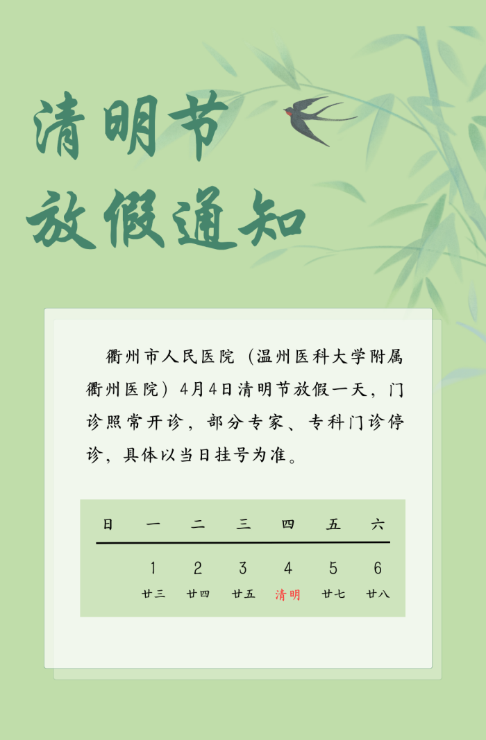 我院2024年清明節(jié)門診安排 文章來源:門診部 作者: 點擊數(shù):2028 更新時間:2024-04-03 上一篇: 五一放“價”,摘鏡出游約一波~~ 下一篇: 衢州首站!“健康浙里行——走基層、惠民生”媒體采風(fēng)活動走進我院