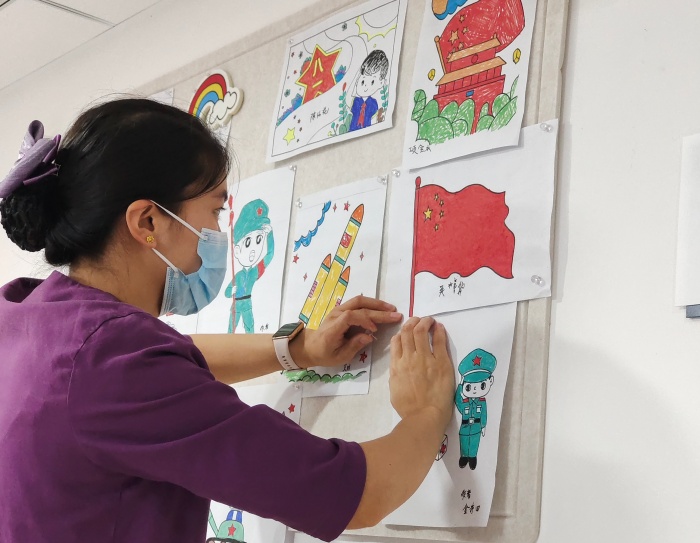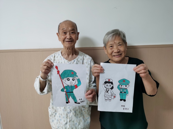活動還設(shè)置了創(chuàng)意涂鴉環(huán)節(jié),老兵們在醫(yī)護(hù)人員的陪伴下,用五顏六色的畫筆描繪出他們心中的國旗、天安門、軍人還有鮮花等等,用另一種方式慶祝自己的節(jié)日,表達(dá)對軍旅生涯的懷念和對當(dāng)下生活的熱愛。